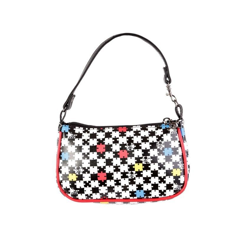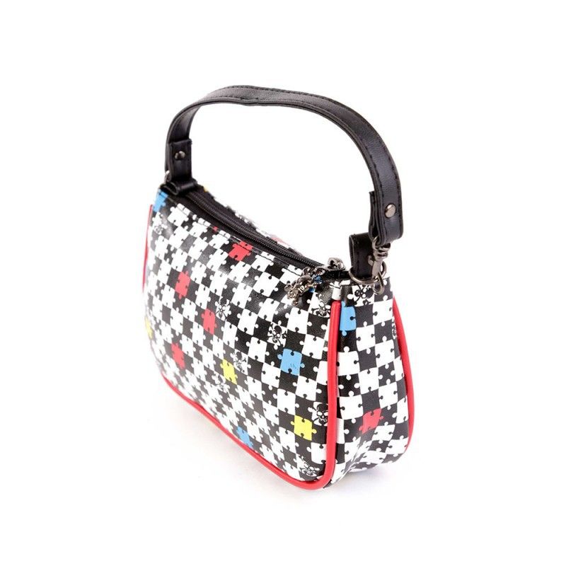 Este bolso de mano es muy cómodo y practico si no quieres cargar con muchas cosas.Por su tamaño también puede servir como neceser o estuche.Está estampado con piezas de puzzle y calaveras,lleva una pequeña calavera colgando de la cremallera