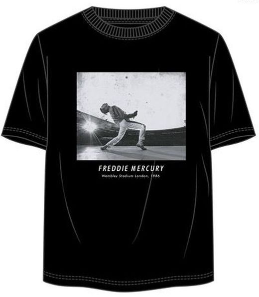 Camiseta de manga corta en color negro con la forma del cuello redonda y el corte de la camiseta acaba en recto. El estampado es frontal y centrado y es una imagen del concierto de Queen en la que sale Freddie Mercury cantando en el estadio de Wembley en 1986.