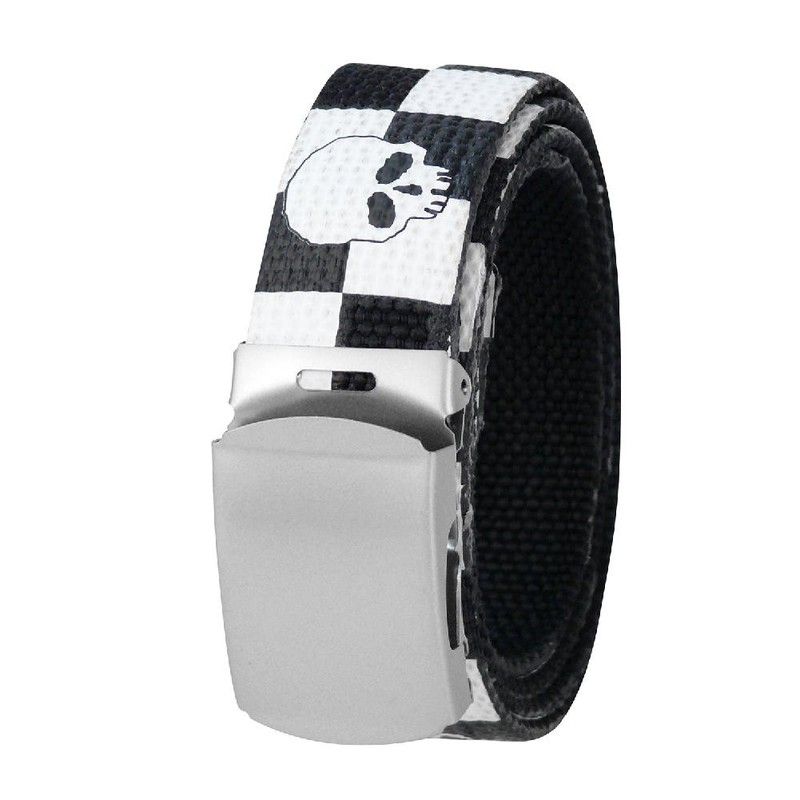 Cinturón de tela a cuadros blancos y negros y estampado de calaveras. Ya que lleva una hebilla ajustable puedes ajustarlo tanto en la cintura como en la cadera para darle un toque diferente a tu outfit.