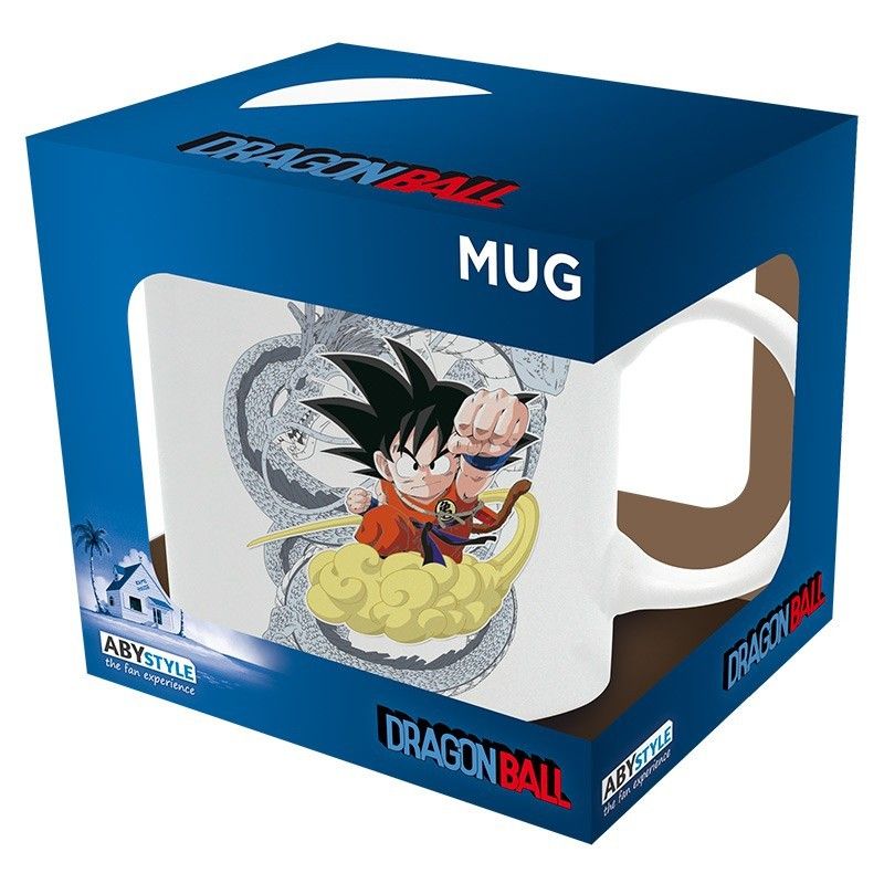Taza de cerámica en color blanco con el estampado de Goku Jr subido en su nube y detrás de él, el dragón Shenron, en el otro extremo de la taza tenemos una de las bolas de dragón, la de 4 estrellas.